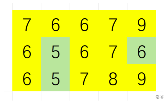 样例 1 如图所示,绿色单元格代表山谷: